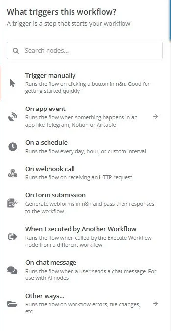 In N8N, you always work with elements called nodes. The starting point of a workflow is the trigger node.