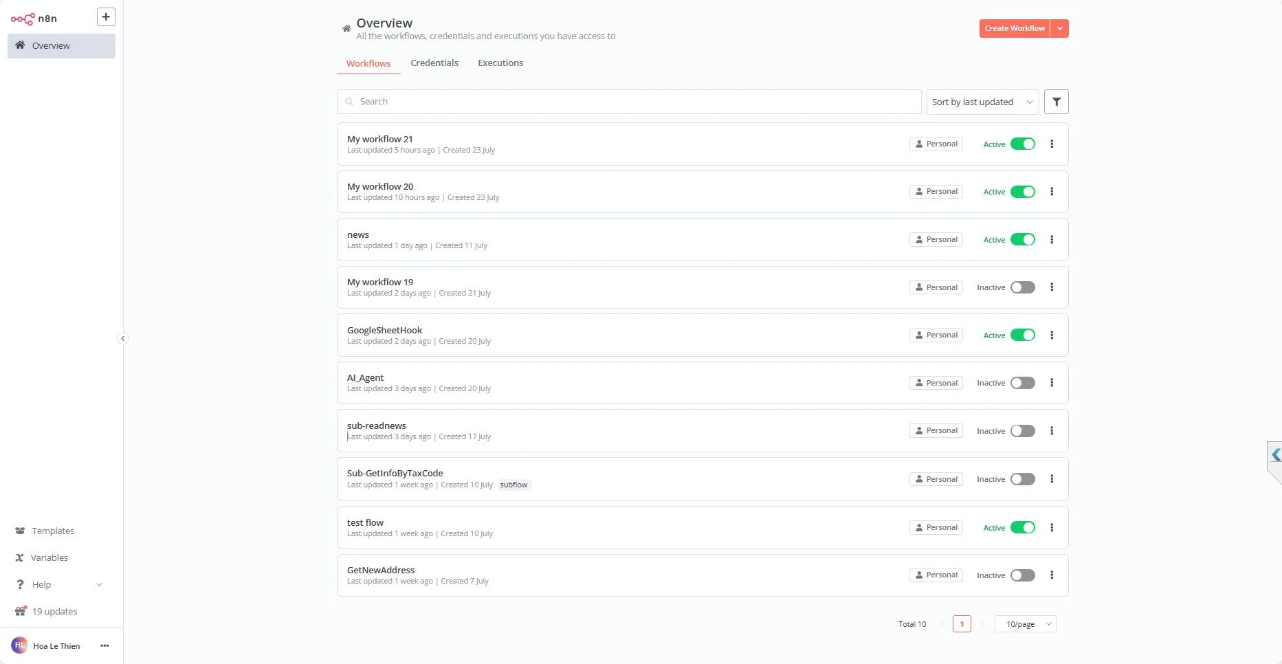 At this view, we can easily manage all the workflows we have created previously, as well as any credentials that we have set up for those workflows. There is no need to wait any longer—let’s get started by creating your first automation workflow right now.