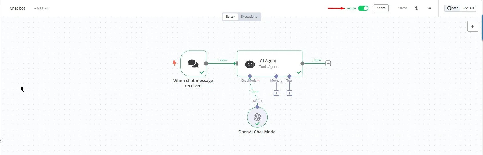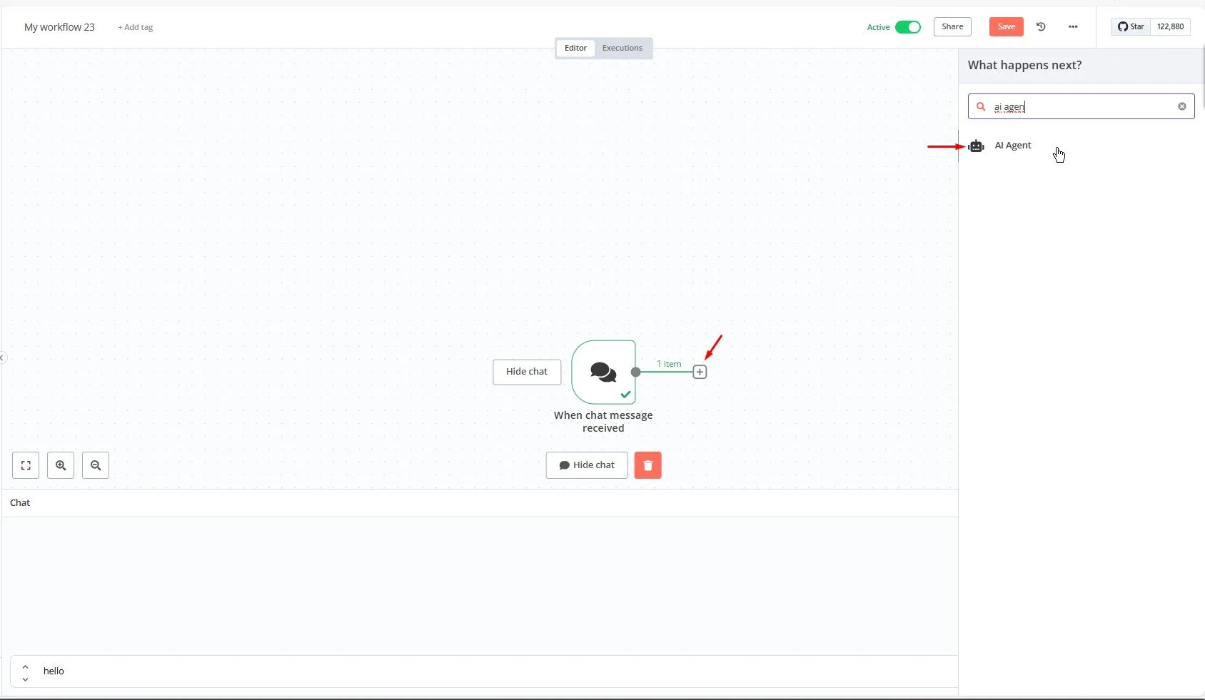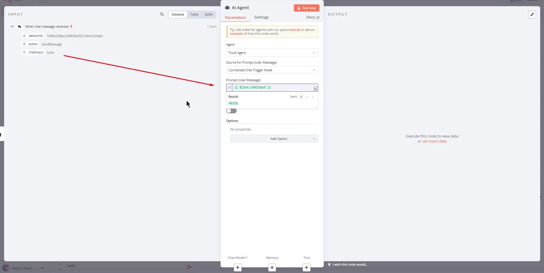 By creating a following node, you create a next step that can handle the data from your previous node. On my demo, I will use the AI Agent node to make a simple custom chatbox