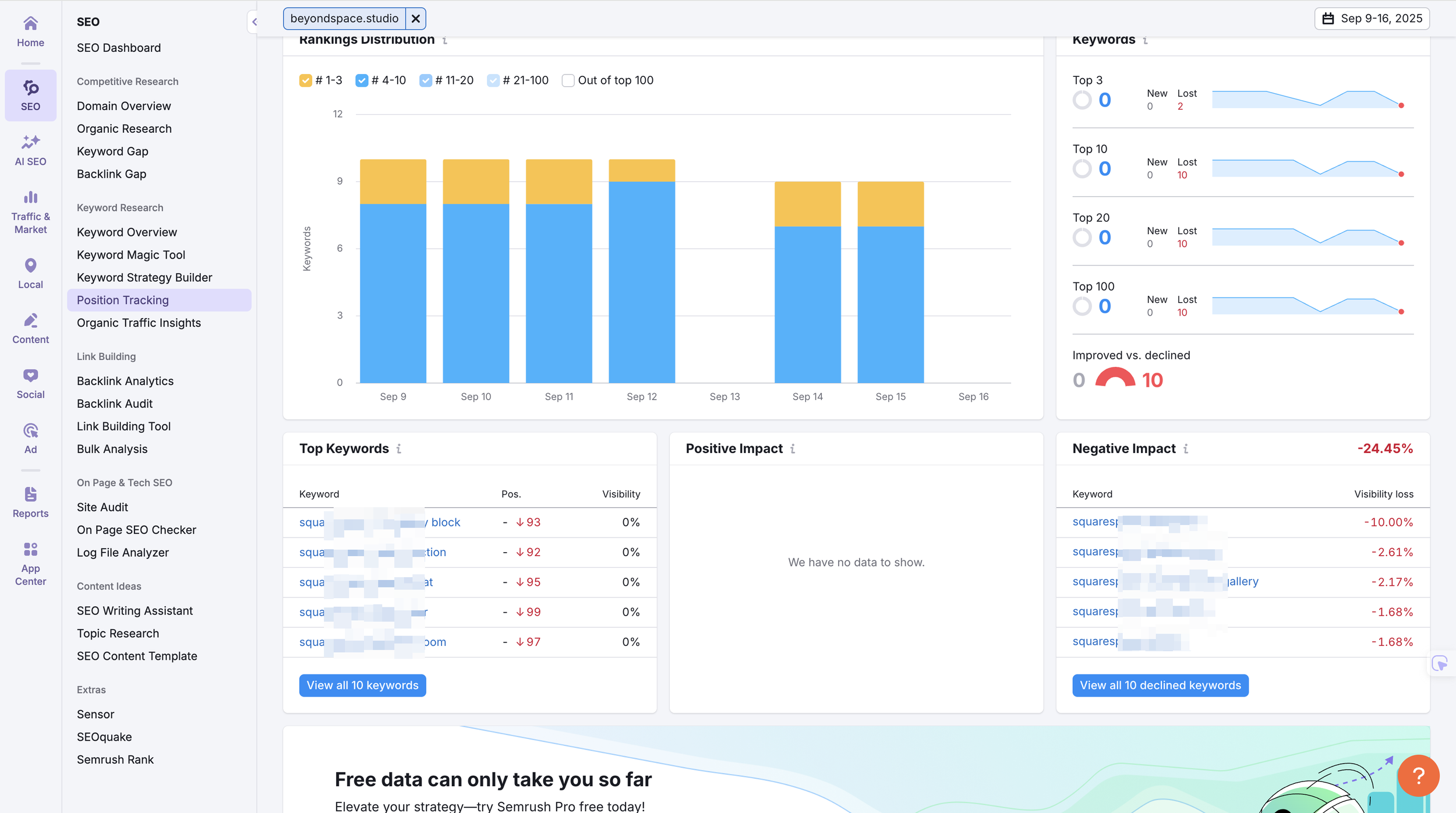 You log into your Semrush dashboard, coffee in hand, expecting the usual green arrows and upward trends. Instead, you're hit with a dashboard alert that looks like a horror movie: every tracked keyword is in freefall, and your position graph has gone vertical, straight into the abyss.