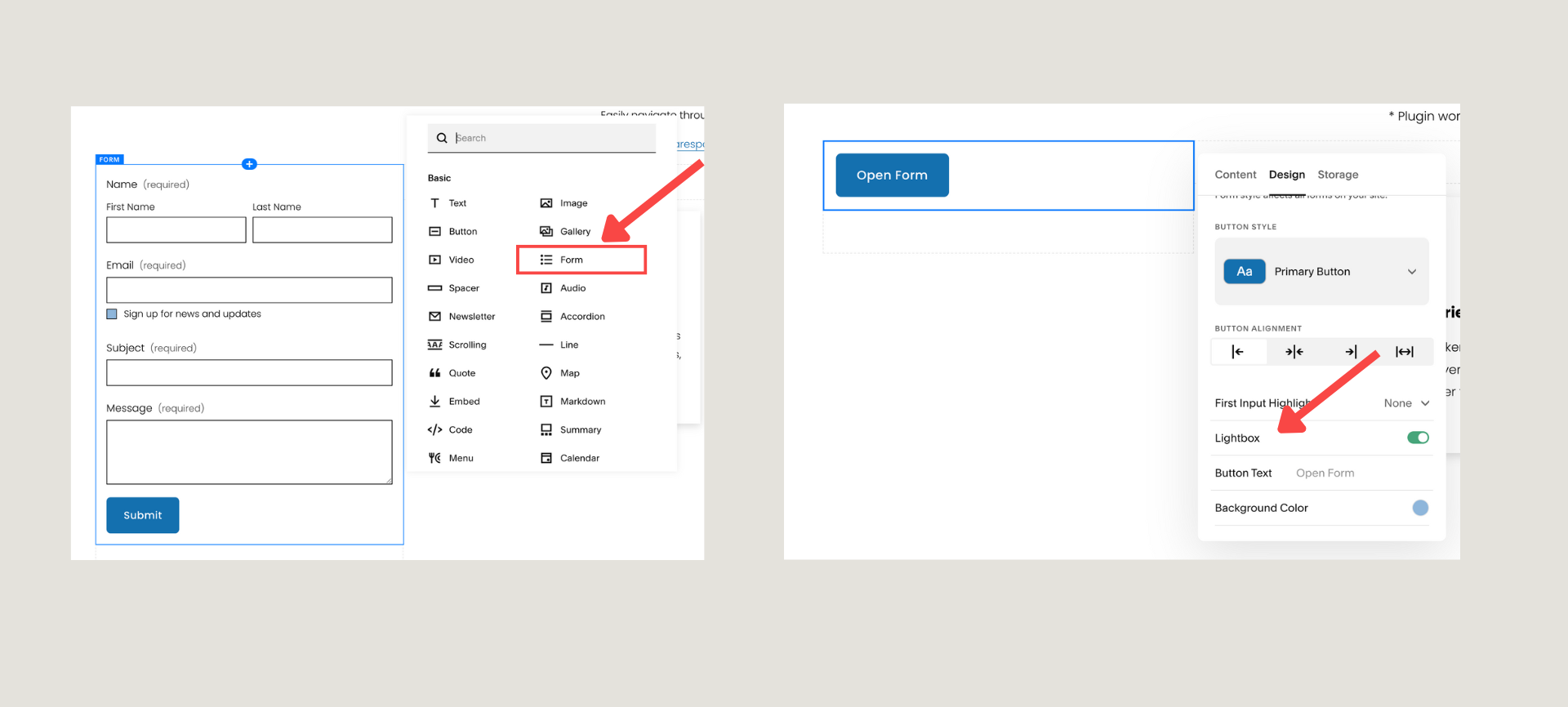 Lightbox Forms remain hidden until a button is clicked, at which point they pop up over the content. This offers a cleaner page design and is perfect for a call-to-action (CTA) button like "Book a Call" or "Request a Quote."