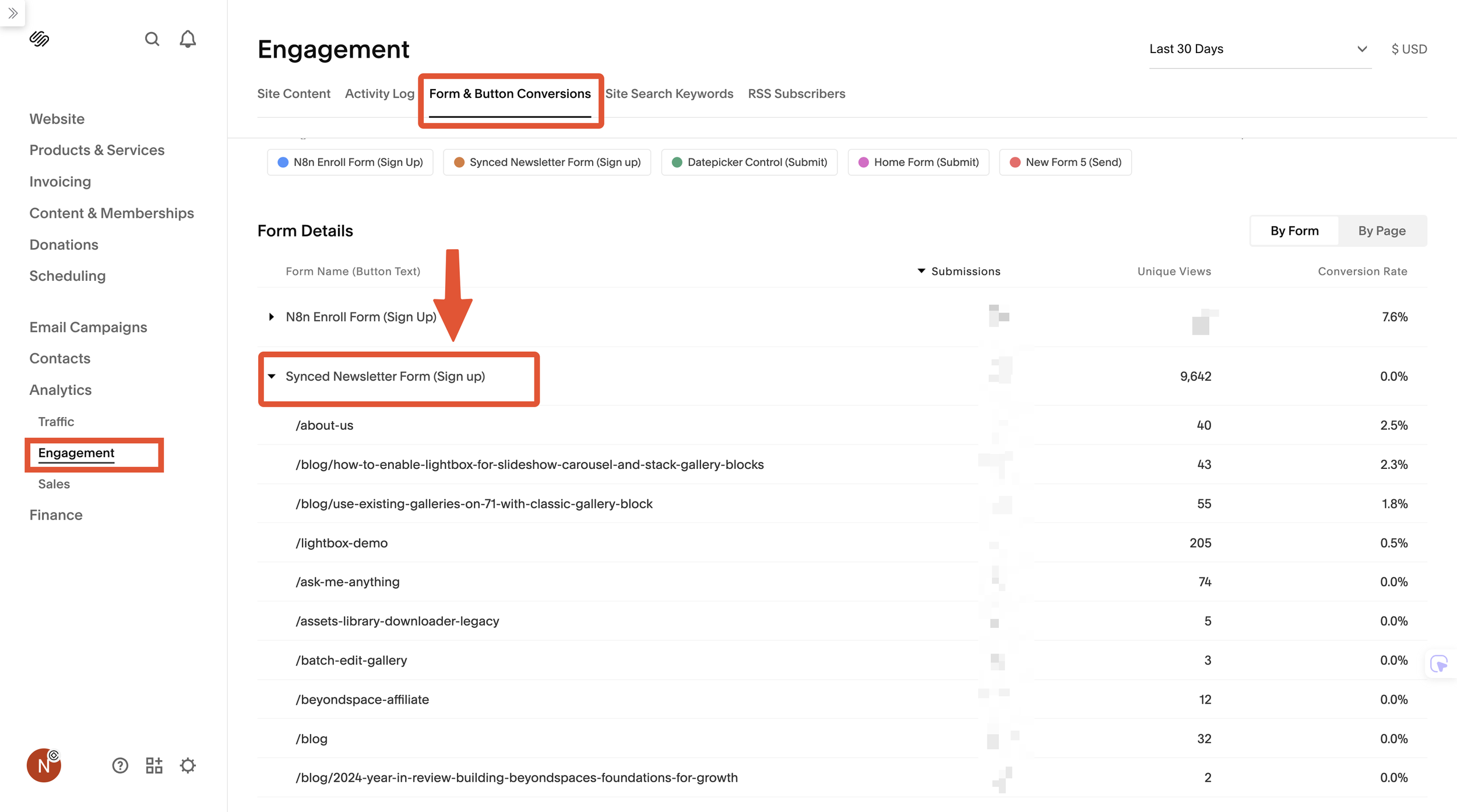 In the screenshot below, you can see how all submissions for our single "Synced Newsletter Form (Sign Up)" are neatly rolled up into one place. This gives you a quick, at-a-glance overview of its performance across your entire website.